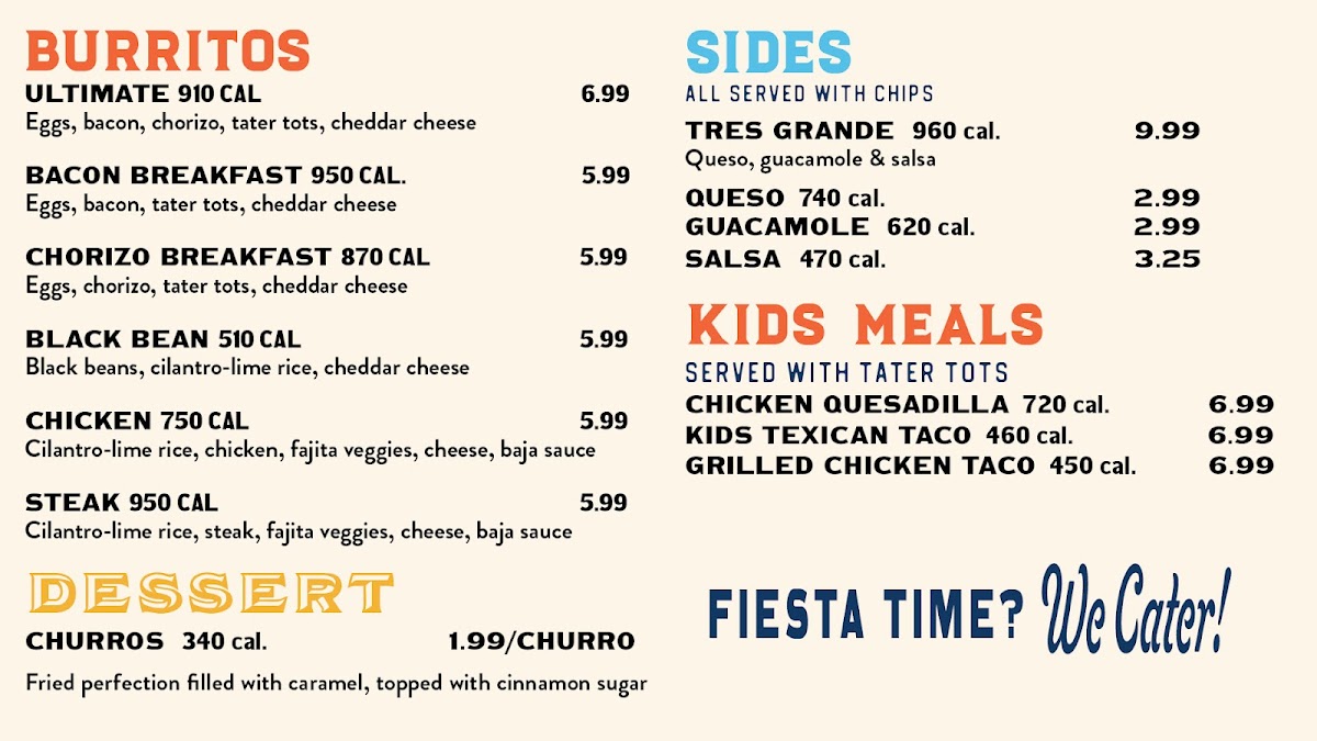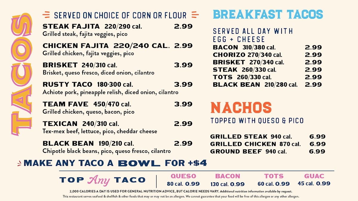 PICK 3 TACOS TEXICAN, BLACK BEAN, OR THE RUSTY SERVED WITH A CHURRO AND FOUNTAIN BEVERAGE.